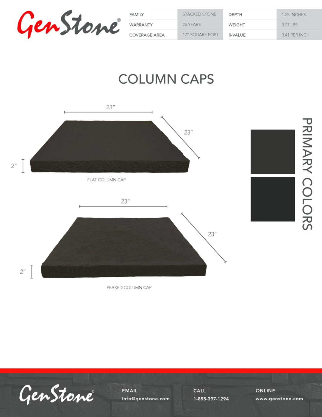 Designed to fit seamlessly on top of four 90° corner panels, the GenStone Column Cap is 23 inches square and provides a modern but rustic finish to your column. Each cap can be easily attached to the column using adhesive and deck screws. Fastener holes can be concealed with color match caulking and paint kit.